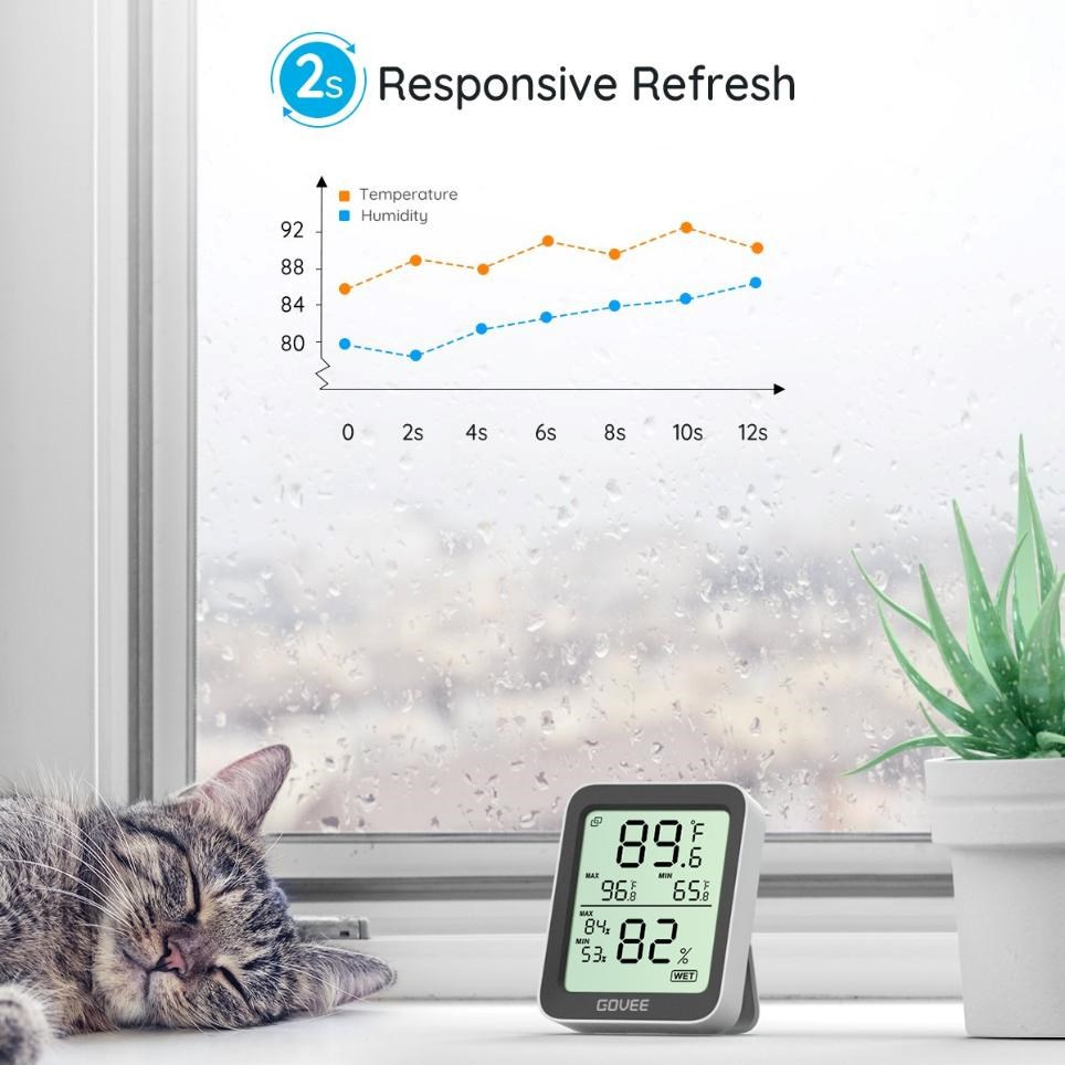 Monitor teploty a vlhkosti Govee je vybavený vysoko presnými senzormi, ktoré merajú teplotu s presnosťou ±0,3 °Ca vlhkosť s presnosťou ±3 % RH. Senzor vlhkosti je vyrobený vo Švajčiarsku. To vám poskytuje spoľahlivé a konzistentné údaje pre dennú kontrolu klímy. Presné meranie je kľúčom k starostlivosti o rastliny, ochrane citlivých predmetov a udržiavaniu zdravého domáceho prostredia. S správnymi údajmi môžete rýchlo a efektívne reagovať na akékoľvek zmeny.