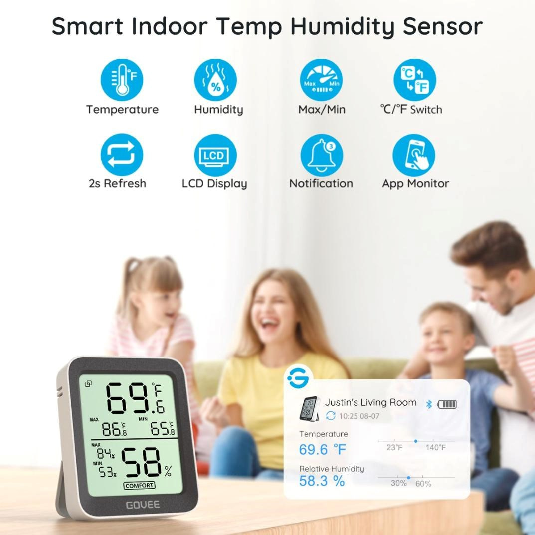 Akčné ponuky na váš e-mailUdržujte svoje vnútorné prostredie príjemné a zdravé. Inteligentný monitor teploty a vlhkosti od Govee. Tento kompaktný, ale výkonný klimatický monitor zobrazuje aktuálnu teplotu a vlhkosť na prehľadnom LCD displeji a vďaka Bluetooth pripojeniu k vášmu telefónu máte svoje údaje vždy poruke. Vďaka vysoko presným senzorom (±0,3 °C pre teplotu a ±3 % RH pre vlhkosť) môžete ľahko sledovať zmeny v akejkoľvek miestnosti, kancelárii alebo skleníku.