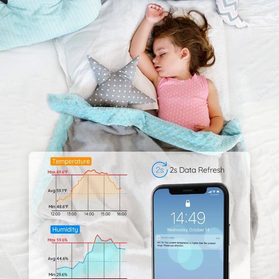 Vďaka kombinácii Wi-Fi a Bluetooth konektivity máte svoje namerané údaje vždy pod kontrolou, či už ste doma alebo mimo domova. V aplikácii Govee Home môžete sledovať teplotu a vlhkosť v reálnom čase priamo na svojom telefóne. Pohodlné vzdialené monitorovanie vám umožňuje rýchlo reagovať na zmeny v prostredí odkiaľkoľvek.