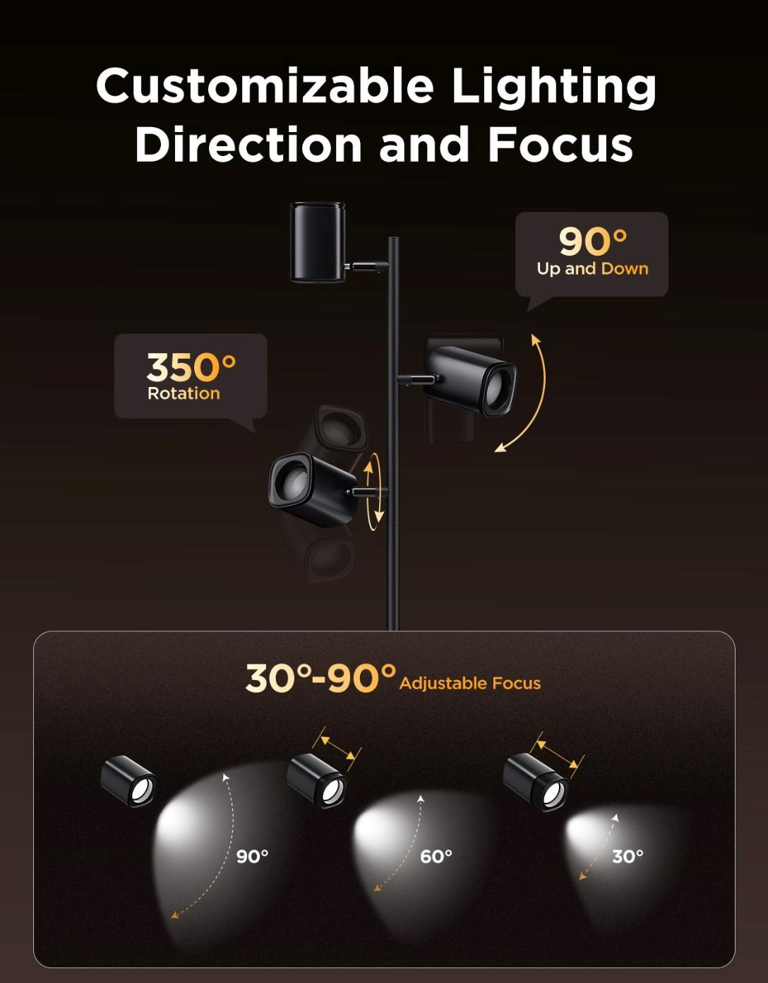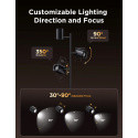 Každé rameno lampy je plne nastaviteľné, čo vám umožní nájsť dokonalý uhol a smer svetla. Ramena sa otáčajú o 350° horizontálne a 90° vertikálne, zatiaľ čo hlavica ponúka jemnú rotáciu 30°–90°. Tým dosiahnete presné nasvietenie priestoru podľa vašich potrieb. Flexibilné ovládanie každého zdroja samostatne vám dáva kontrolu nad jasom, farbou aj zapnutím. Vďaka tejto variabilite je lampa skvelá na čítanie, ako aj na zvýraznenie dizajnových prvkov v interiéri.
