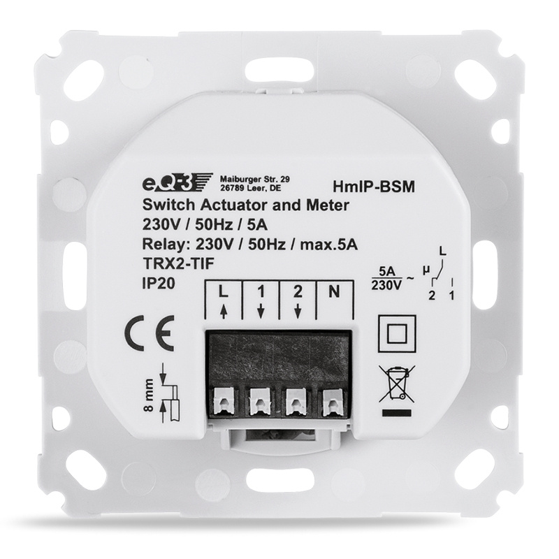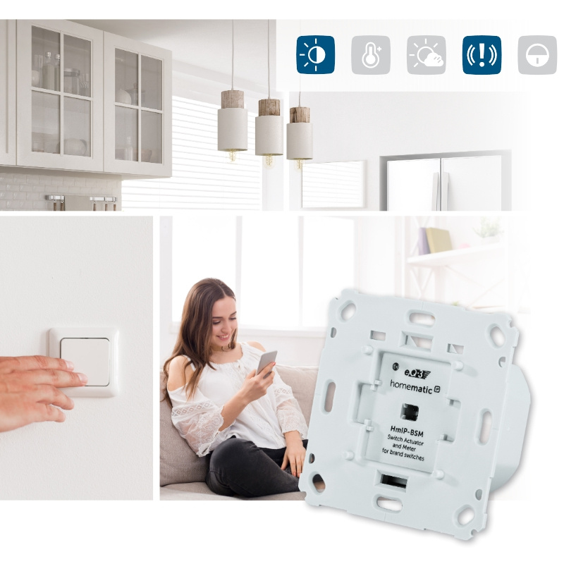 Spínací akčný člen (HmIP-BSM) sa montuje do štandardnej zápustnej krabice pod omietku s pripojením do siete 230 V. Bezdrôtová komunikácia ponúka možnosť inštalácie bez potreby dodatočnej kabeláže. To znamená, že akčný člen možno umiestniť na miesto s pripraveným alebo existujúcim elektrickým rozvodom siete 230 V.