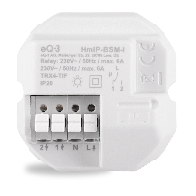 Spínací akčný člen (HmIP-BSM-I) sa montuje do štandardnej zápustnej elektroinštalačnej krabice pod omietku s pripojením do siete 230 V. Bezdrôtová komunikácia ponúka možnosť inštalácie bez potreby druhej kabeláže. To znamená, že akčný člen možno umiestniť v mieste pripraveného alebo existujúceho elektrického rozvodu siete 230 V.