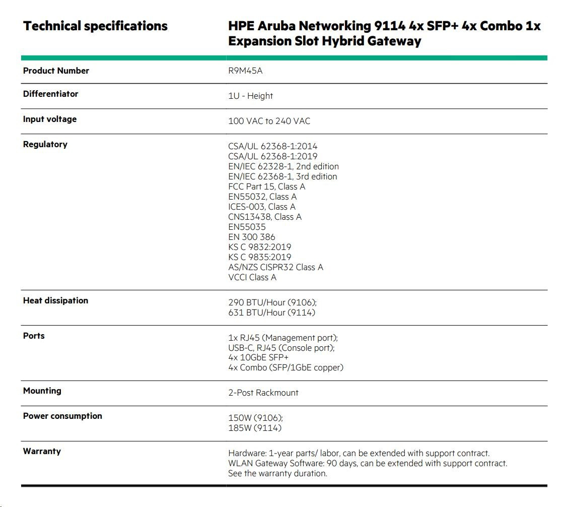 Popis HPE Aruba Networking 9114 4x SFP+ 4x Combo 1x Expansion Slot Hybrid Gateway
