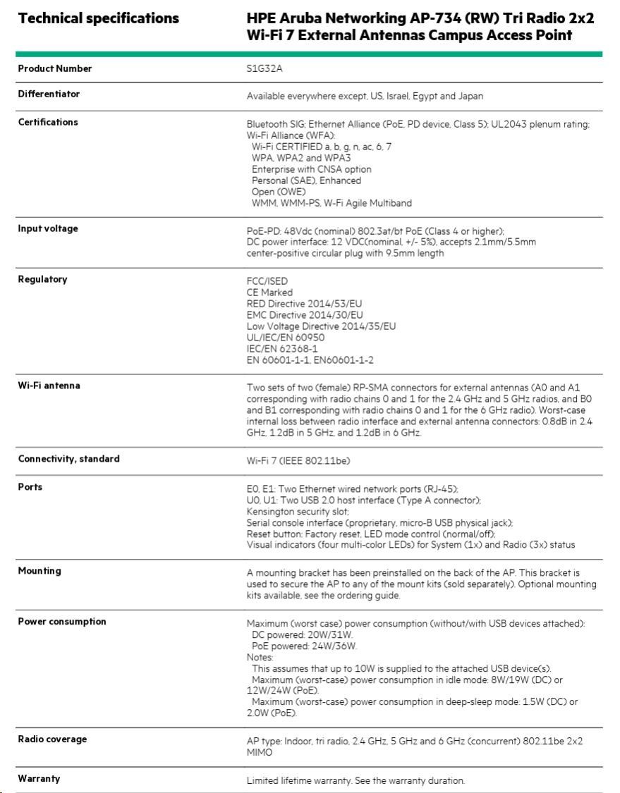 HPE Aruba Networking AP-734 (RW) Tri Radio 2x2 Wi-Fi 7 External Antennas Campus Access Point