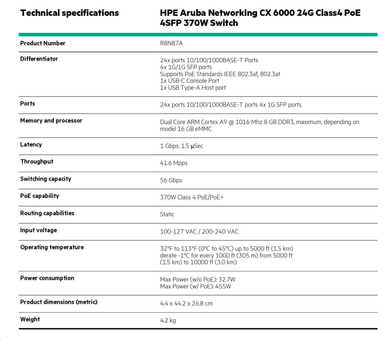 HPE Aruba Networking CX 6000 24G Class4 PoE 4SFP 370W Switch.