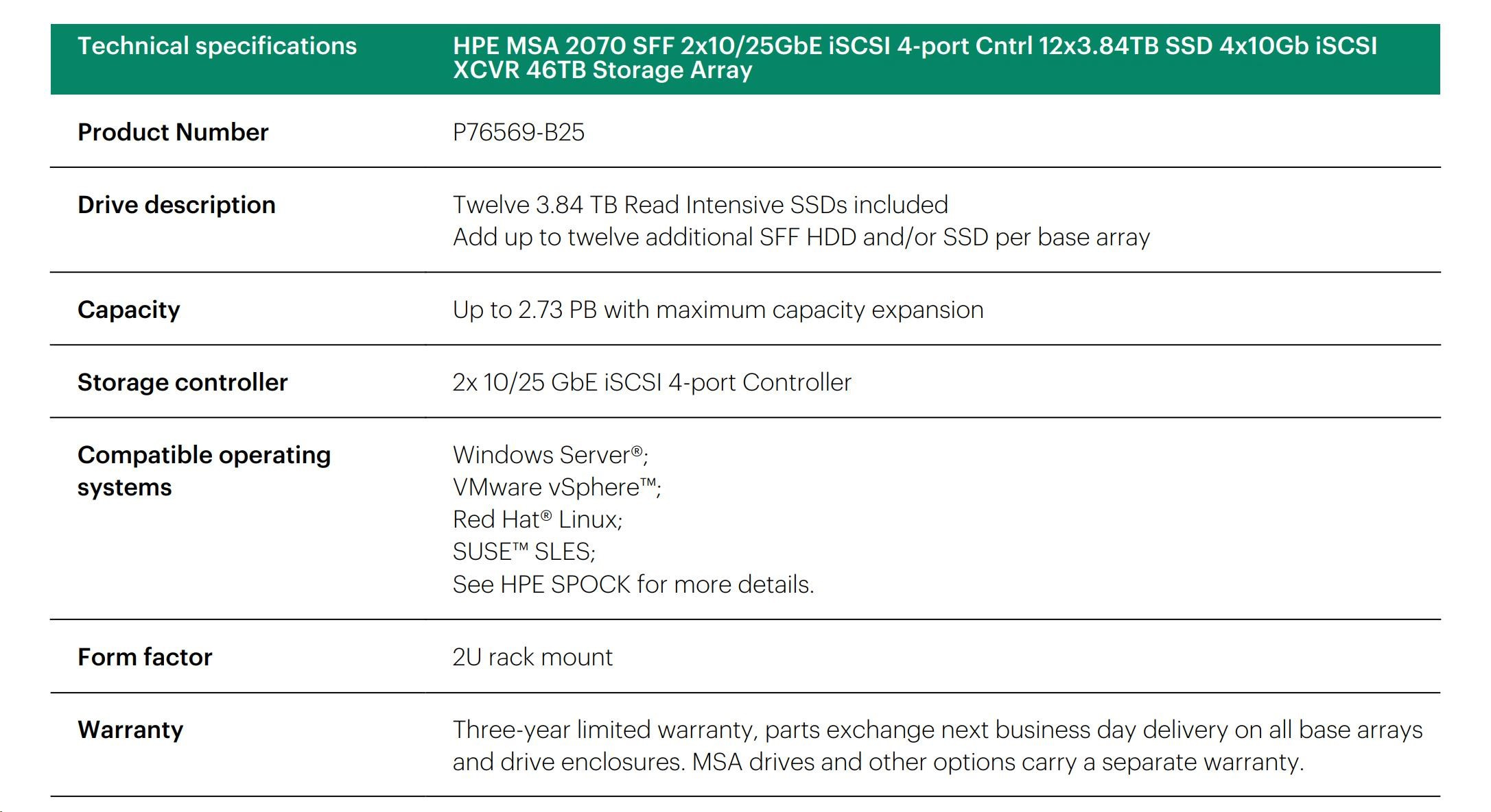 HPE MSA 2070 SFF 2x10/25GbE iSCSI 4-port Cntrl 12x3.84TB SSD 4x10Gb iSCSI XCVR 46TB Storage Array.
