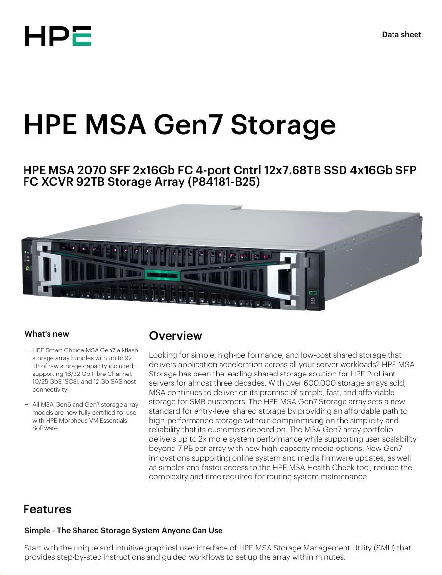 Popis HPE MSA 2070 SFF 2x16Gb FC 4-port Controller 12x7.68TB SSD 4x16Gb SFP FC XCVR 92TB Storage Array Smart Choice
