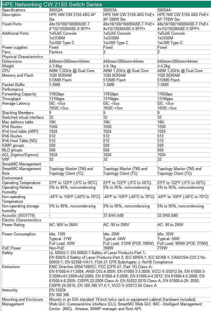 Popis HPE Networking CW 2150 48p 10M/100M/1G PoE+ 4p SFP+ 1G/10G 770W Switch
