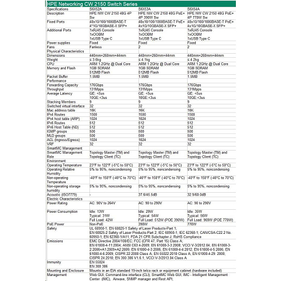 HPE Networking CW 2150 48p 10M/100M/1G PoE+ 4p SFP+ 1G/10G 770W Switch