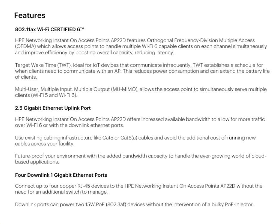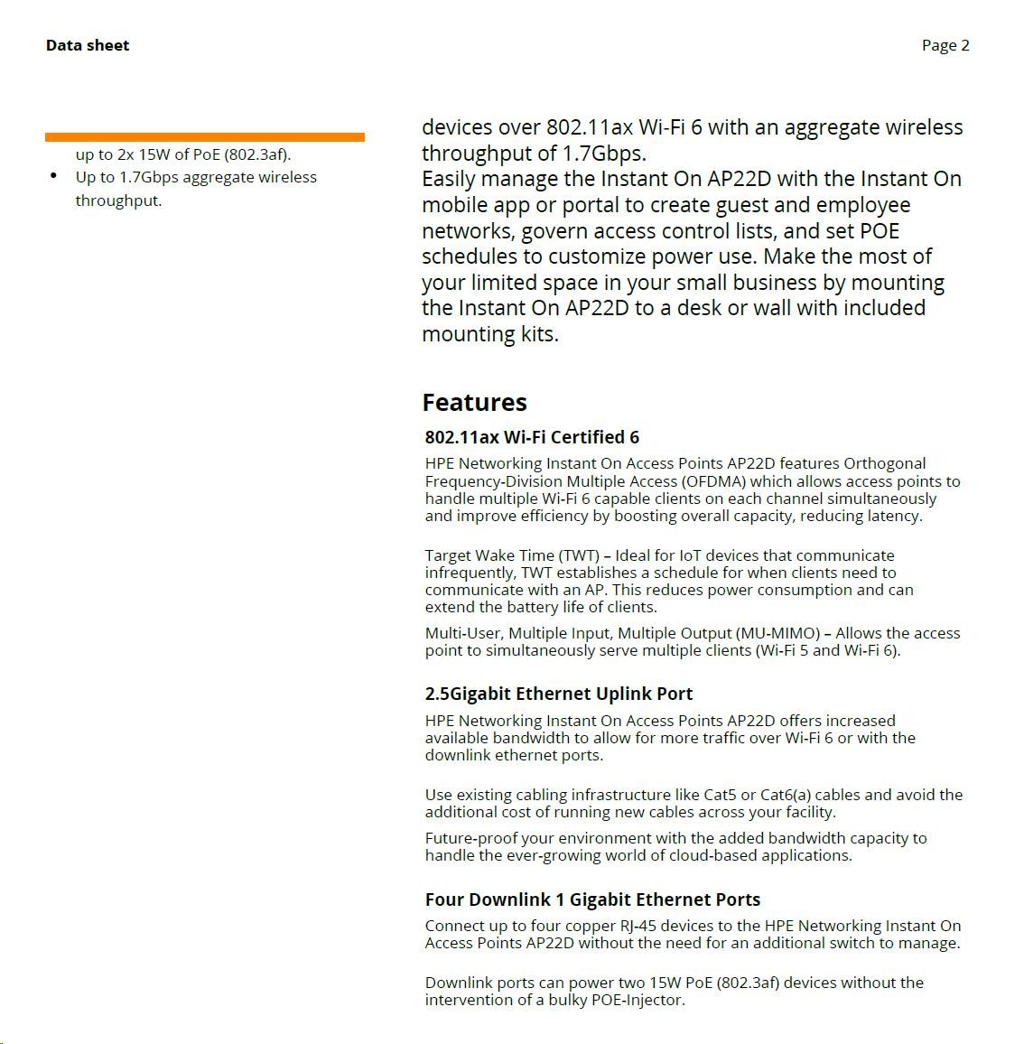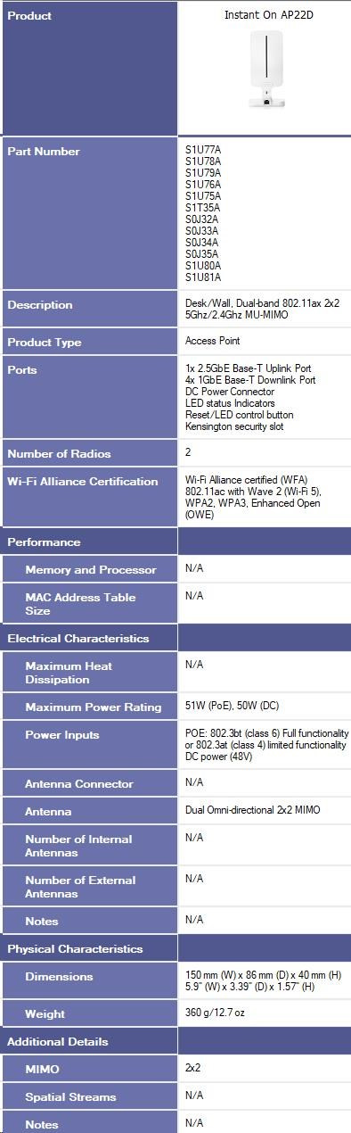 Popis HPE Aruba Instant On Access Point AP22D Bundle with PSU Dual Radio 2x2 Wi-Fi 6 (EU) AP22D (desktop or wallmount)