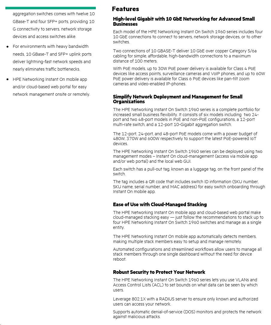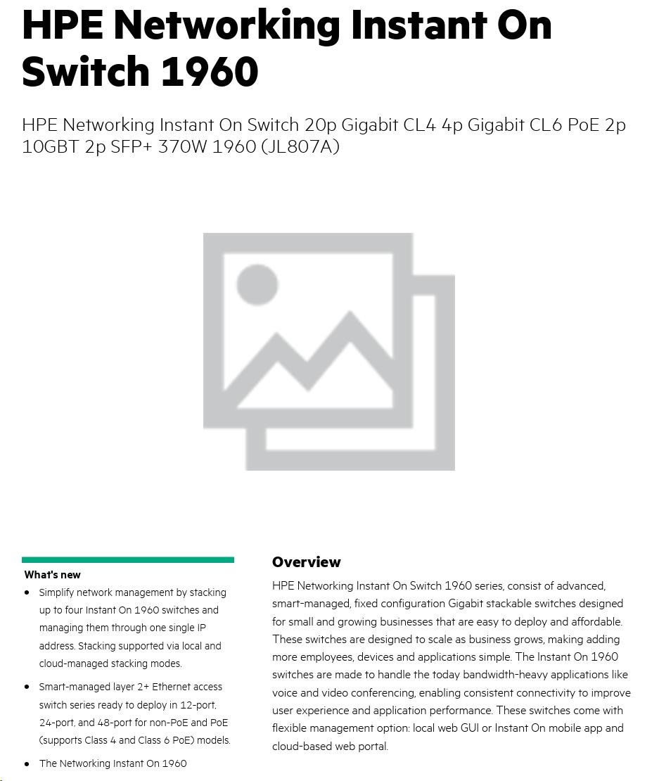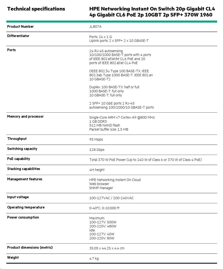Akčné ponuky na váš e-mailHPE Networking Instant On Switch 20p Gigabit CL4 4p Gigabit CL6 PoE 2p 10GBT 2p SFP+ 370W 1960 (JL807A)