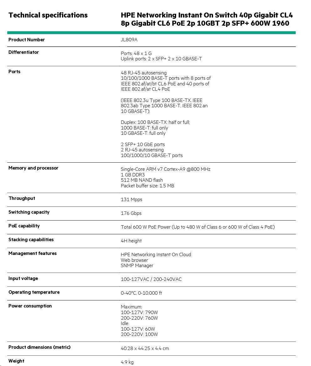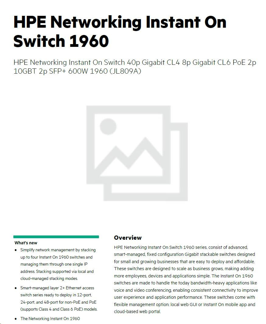 Akčné ponuky na váš e-mailHPE Networking Instant On Switch 40p Gigabit CL4 8p Gigabit CL6 PoE 2p 10GBT 2p SFP+ 600W 1960 (JL809A)