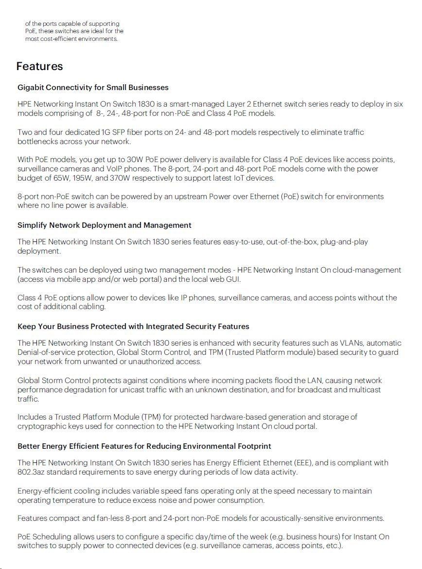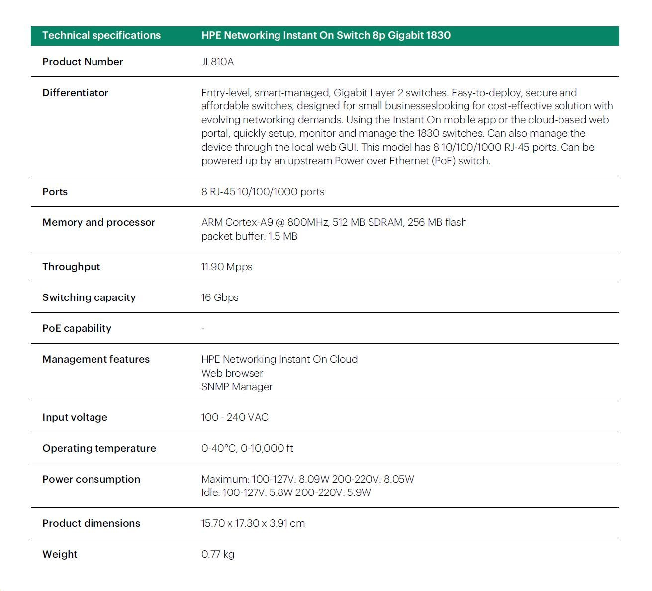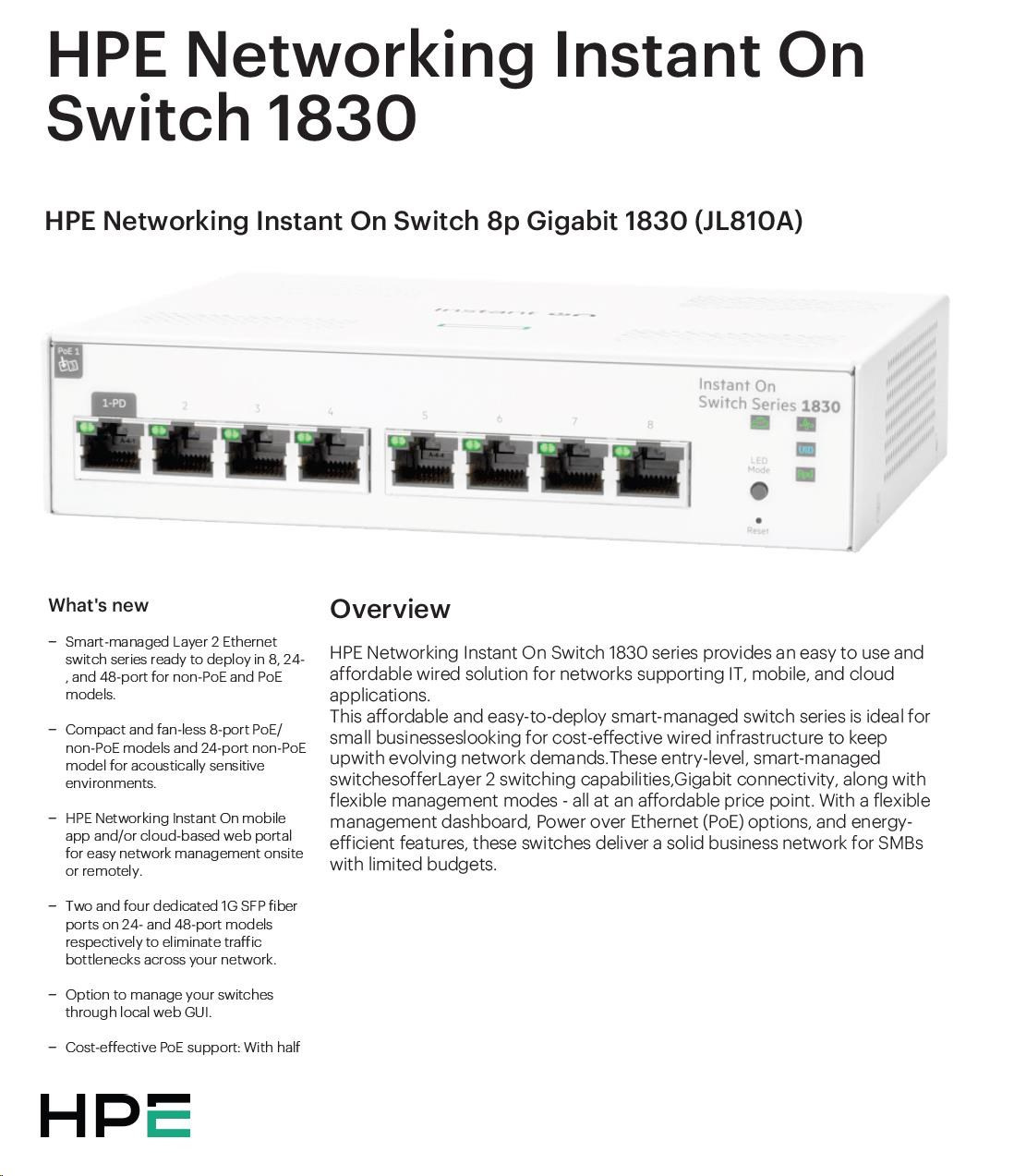 | Aruba Instant On 1830 8G Switch (JL810A) | Aruba Instant On 1830 8G 4p Class4 PoE 65W Switch (JL811A) | Aruba Instant On 1830 24G 2SFP Switch (JL812A) | Aruba Instant On 1830 24G 12p Class4 PoE 2SFP 195W Switch (JL813A) | Aruba Instant On 1830 48G 4SFP Switch (JL814A) | Aruba Instant On 1830 48G 24p Class4 PoE 4SFP 370W Switch (JL815A) | ||||