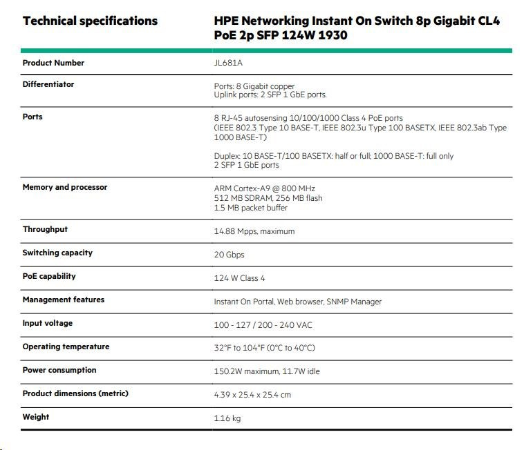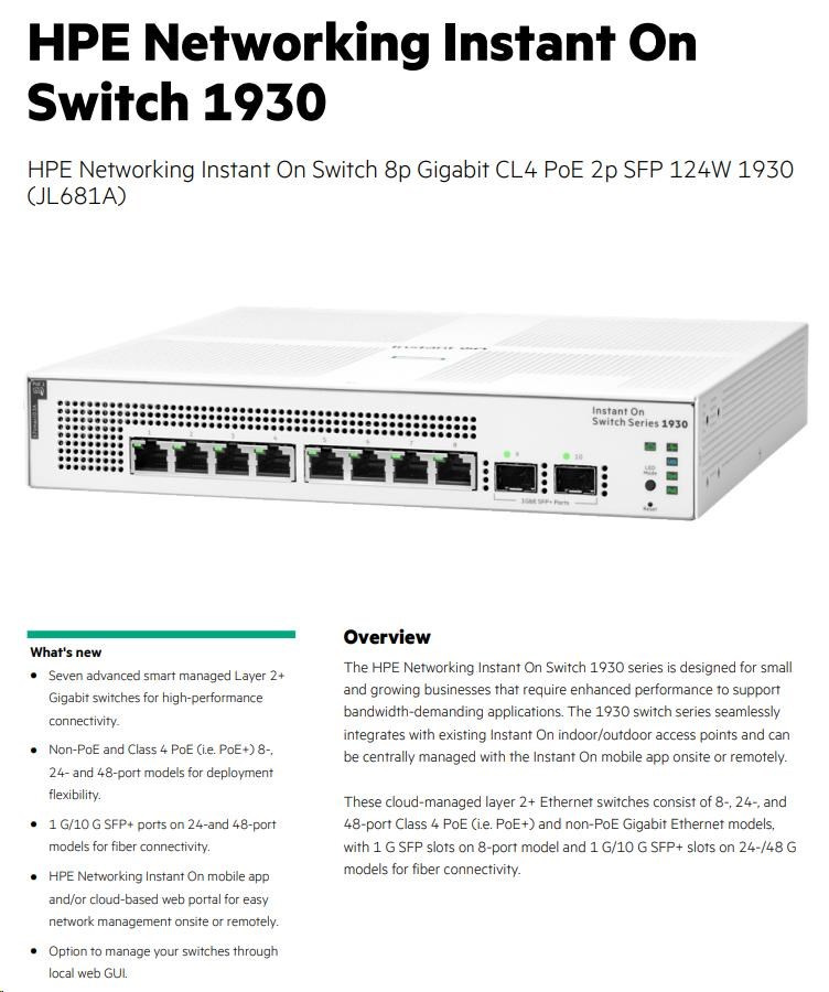 Akčné ponuky na váš e-mailHPE Networking Instant On Switch 8p Gigabit CL4 PoE 2p SFP 124W 1930 (JL681A)