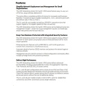 | Features Accessed Through Local Web-Management Interface Static IPv4 routing Supports manual routing configuration of up to 32 static routes. Auto-voice VLAN Recognizes IP phones and automatically assigns voice traffic to dedicated VLAN for IP phones. PoE scheduling A PoE scheduler provides the ability to define the hours of PoE power being supplied to a group of switch ports based on a 24-hour day. The scheduler enables the flexibility to select individual days of a week as well as reccurrence on a weekly basis with a start and end date. Access Control Lists (ACLs) Enables network traffic filtering by creating an ACL, adds rules and matches criteria to an ACL, and applies the ACL to permit or deny on one or more interfaces or a VLAN. Supports 50 inbound IPv4 and MAC ACLs with up to 480 ACEs. IPv6 host Enables switches to be managed and deployed at the IPv6 network's edge. Rate limiting Sets and enforces per-port ingress traffic limits based on percentages or packets per second. ARP Attack prevention Dynamic ARP protection blocks ARP broadcasts from unauthorized hosts, preventing eavesdropping or theft of network data. DHCP snooping Provides network security by filtering untrusted DHCP messages. Port security Ports in a port isolation group are restricted from forwarding Layer 2 traffic between ports in that group, providing data privacy and security. SCP and TFTP file transfer Provides different mechanisms for secure file transfer through SCP (Secure Copy Protocol) or TFTP. Dual image support Provide independent primary and secondary software images for backup while upgrading. User account management Password strength checking and aging feature provides enhanced security to user account administration to the local web management interface. Secure Sockets Layer (SSL) Encrypts all HTTP traffic, secures access to the local browser- based management of the switch. SNMPv1, v2c, and v3 Facilitate management of the switch, as the device can be discovered and monitored from an SNMP management station. Remote monitoring (RMON) Remote monitoring (RMON) provides advanced monitoring and reporting capabilities for statistics, history, alarms and events. RMON data is retrieved from the switch through a network management platform over SNMP. |