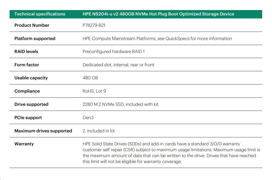 HPE NS204i-u v2 480GB NVMe Hot Plug Boot Optimized Storage Device P78279-B21 RENEW