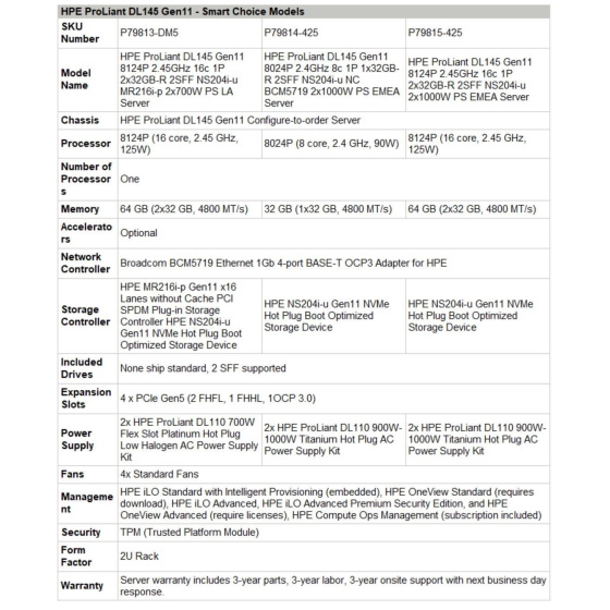 Akčné ponuky na váš e-mailHPE PL DL145g11 AMD 8024P (2.4/8C) 1x32G 2SFF NS204i-u 2x1000W 4x1Gb Smart Choice