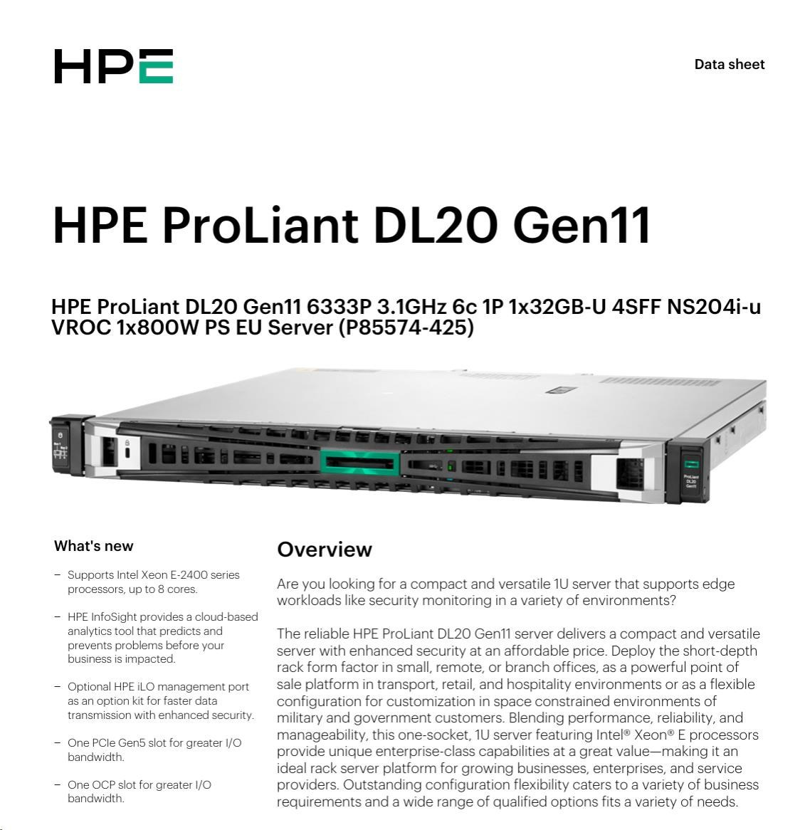 Popis HPE PL DL20g11 6333P (3.1G/6C12T) 1x32G (P64339) NS204(2x480G) 4SFF VROC 1x800W 4x1G NBD333 Smart Choice