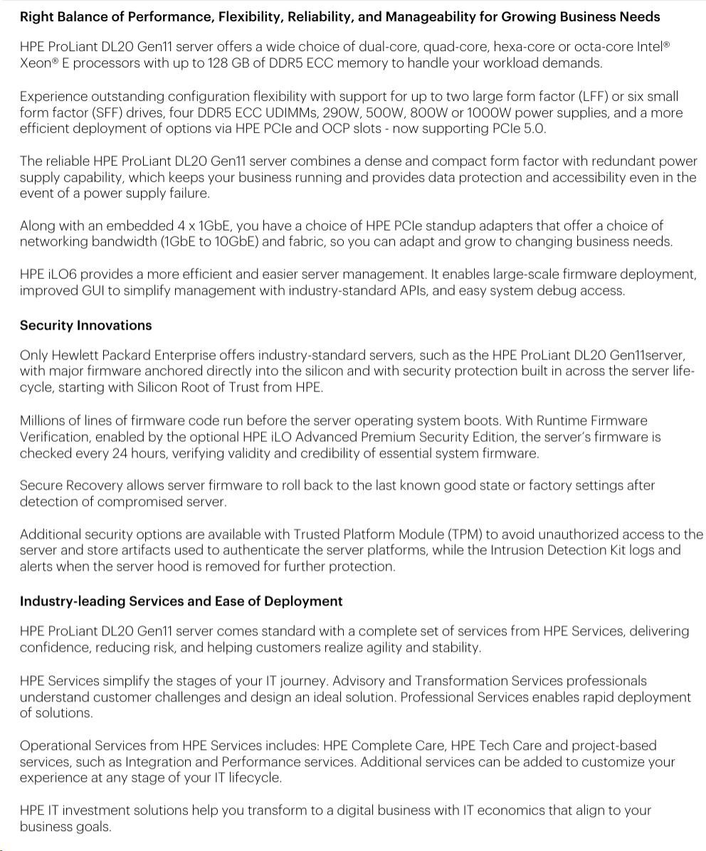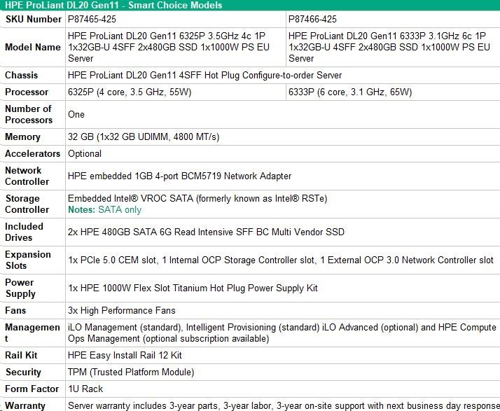 Popis HPE PL DL20g11 6325P (3.5G/4C8T) 1x32G 2x480G SSD VROC 4SFF-HP 4p1Gb 1x1000W Smart Choice