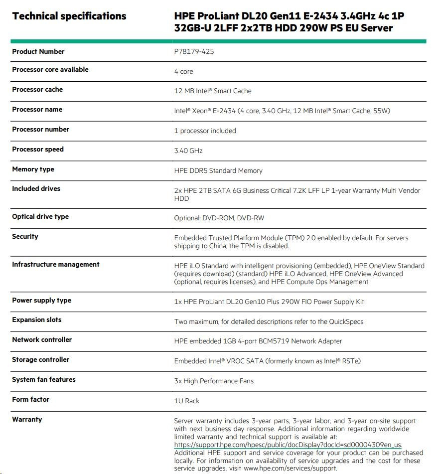 Popis HPE PL DL20g11 E-2434 (3.4G/4C) 1x32G 2x2TB/7.2k SATA VROC 2LFF-HP 4x1Gb 290W Smart Choice