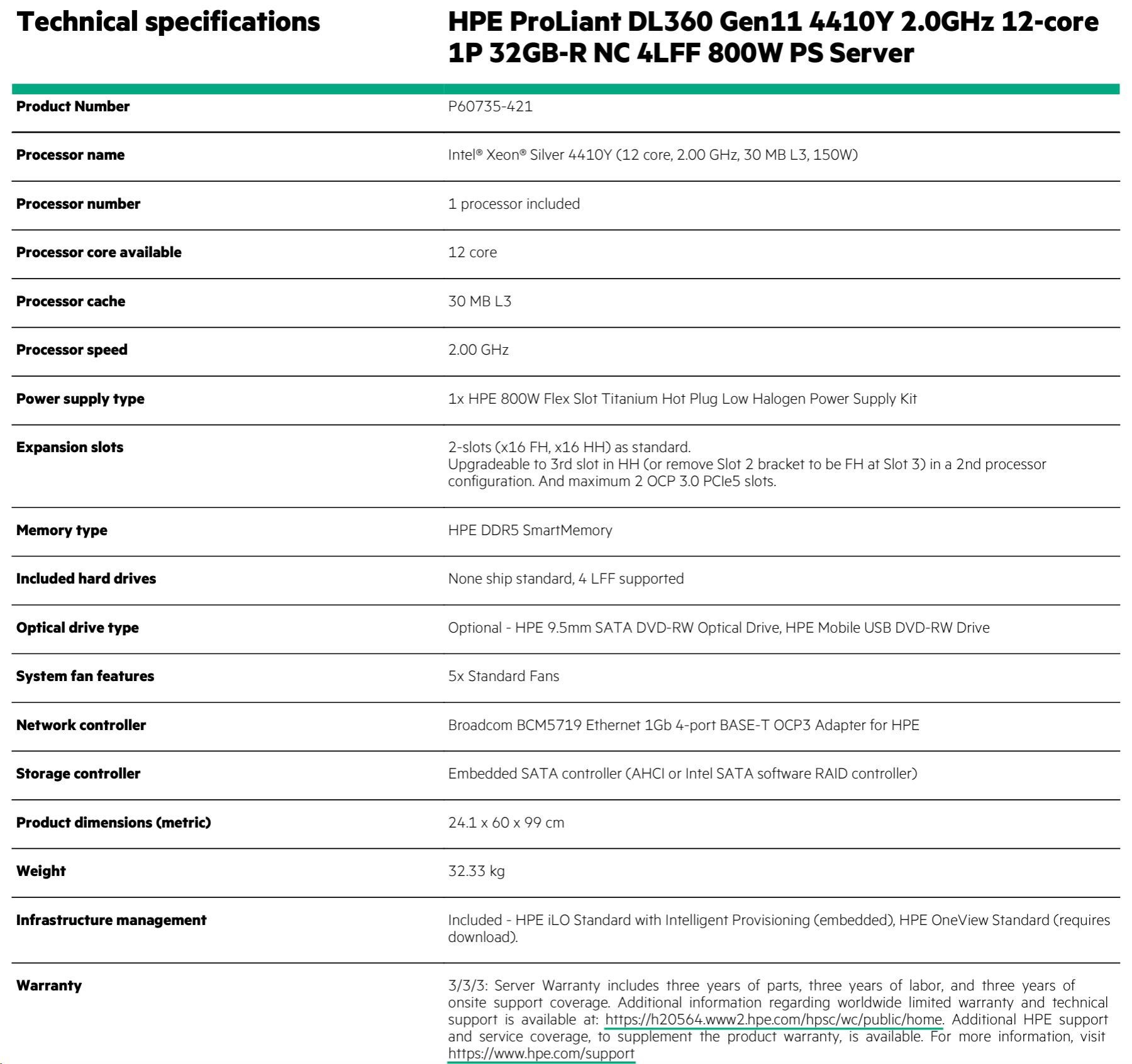 Model Name HPE ProLiant DL360 Gen11 4410Y 2.0GHz 12-core 1P 32GB-R NC 4LFF 800W PS Server