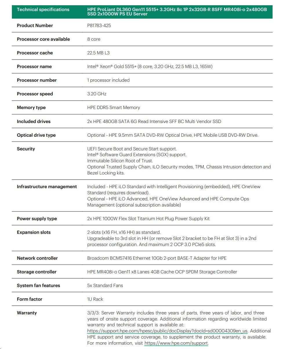 Popis HPE PL DL360g11 5515+ (3.2G/8C) 2x32G (P64706) 2x480G 8SFF MR408i-o/4G 2x1000W 2x10G-T