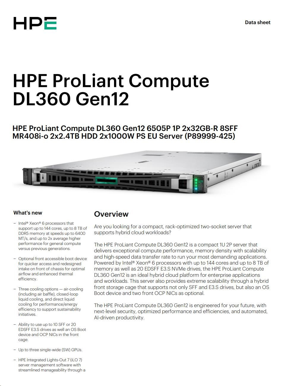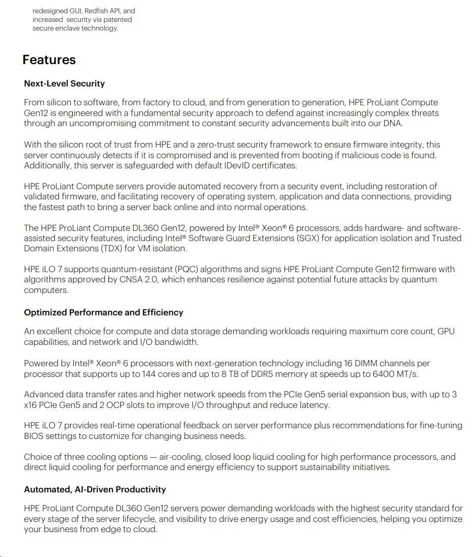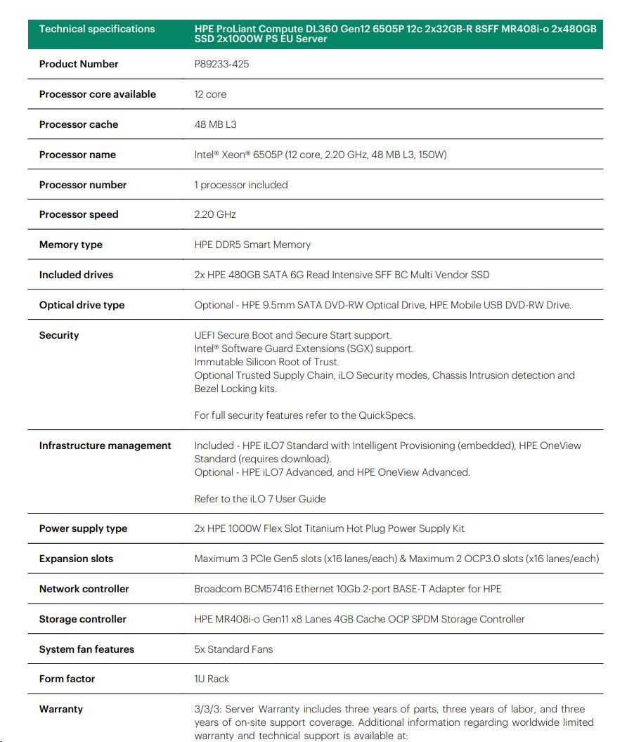 Popis HPE PL DL360g12 6505P (2.2G/12C) 2x32G (P69727) 2x2.4TB MR408i-o 8SFF 2x1000W 2p10GbE NBD333 Smart Choice