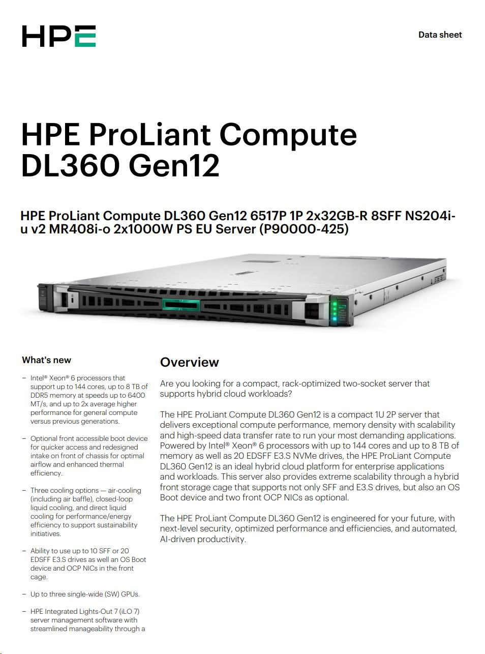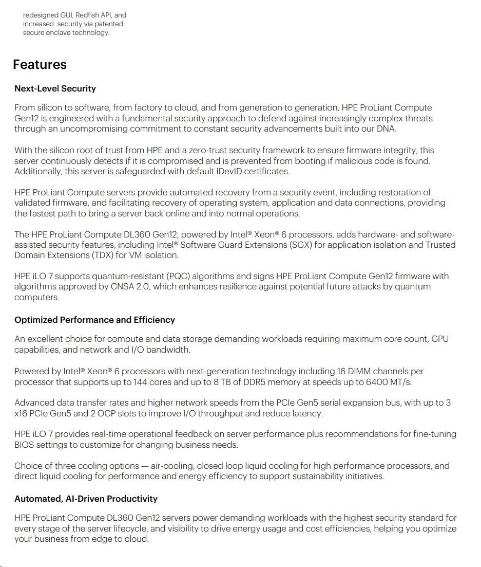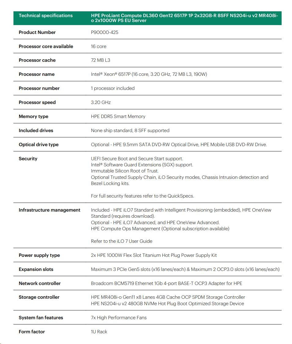 Popis HPE PL DL360g12 6517P (3.2/16C) 2x32G (P69727) NS204 (2x480) MR408i-o 8SFF 2x1000W 4p1G NBD333 Smart Choice