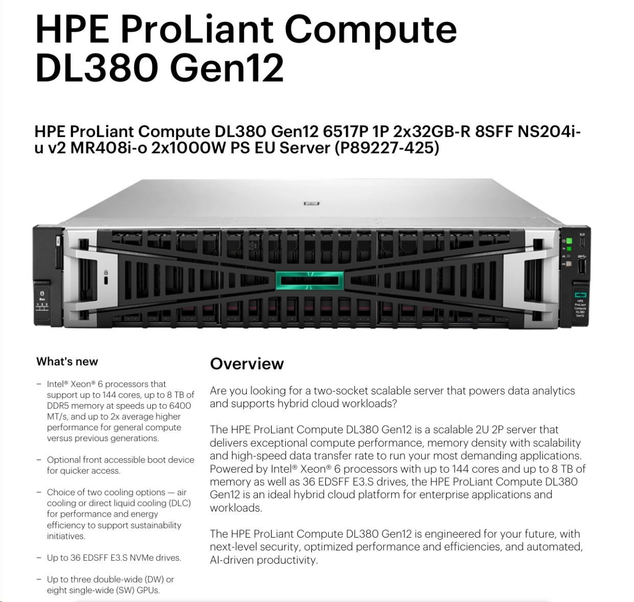 Popis HPE PL DL380g12 6515P (2.2/16C) 2x32G (P69727) 2x480G MR408i-o 8SFF 2x1000W 2p10G-T NBD333 Smart Choice