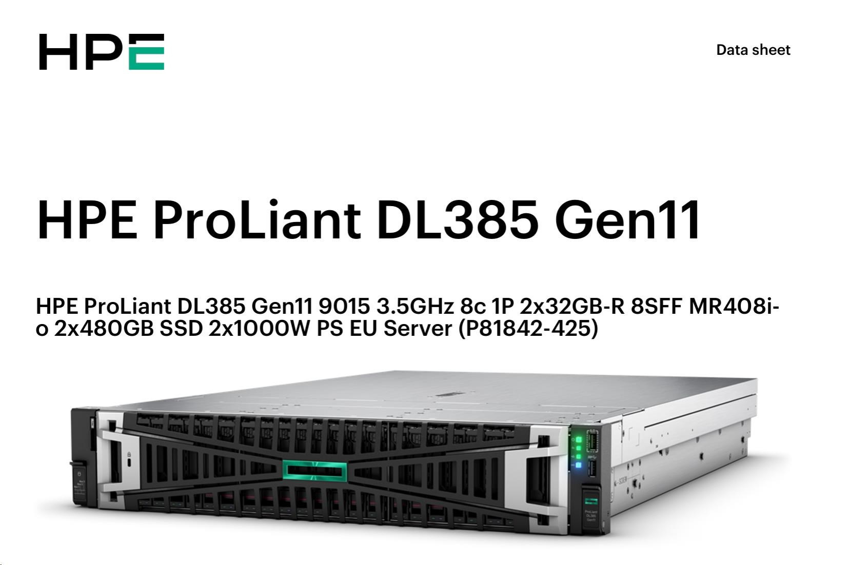 Technical specifications HPE ProLiant DL385 Gen11 9015 2.6GHz 8c 1P 2x32GB-R 8LFF HPE MR408i-o 2p10Tocp 2x1000W PS EU