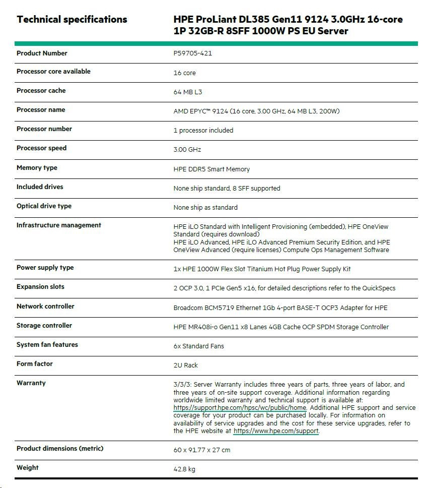 | Model Name | HPE ProLiant DL385 Gen11 9124 2.7GHz 16-core 1P 32GB-R 8SFF 800W PS Server |