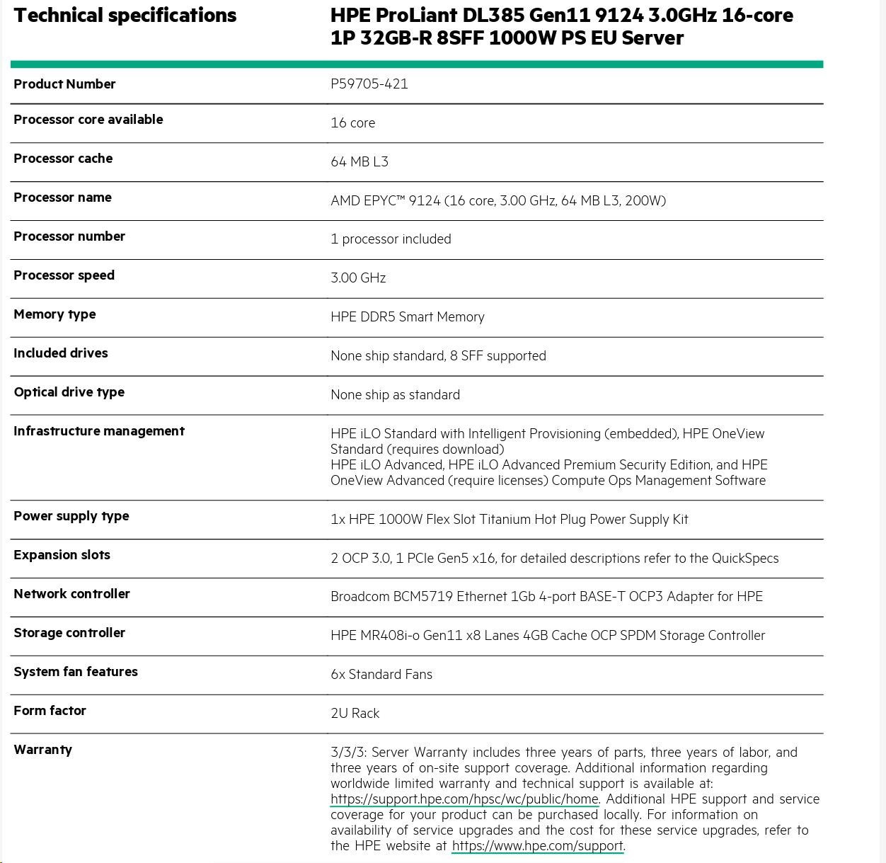 | Model Name | HPE ProLiant DL385 Gen11 9124 2.7GHz 16-core 1P 32GB-R 8SFF 800W PS Server |