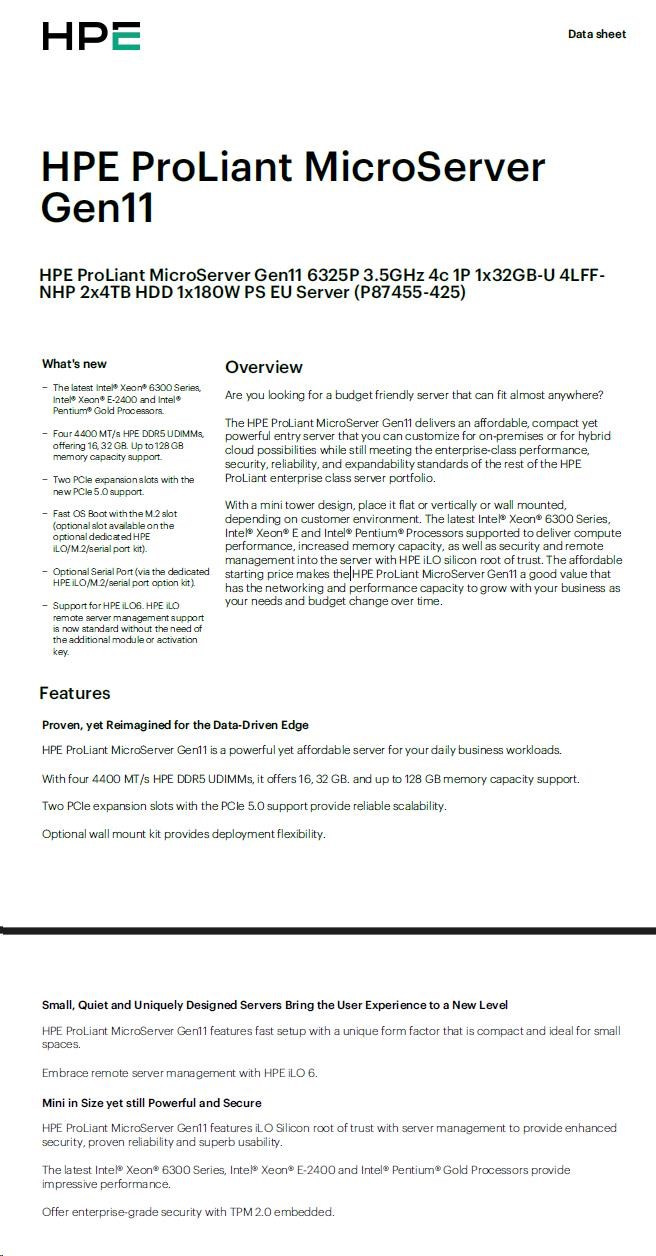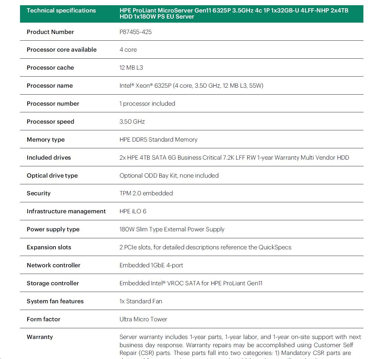 HPE PL MicroServer Gen11 6325P (3.5/4C) 1x32G 2x4TB SATA 4LFF/SFF-NHP VROC 4p1G iLoPort (P65741) NBD111 Smart Choice