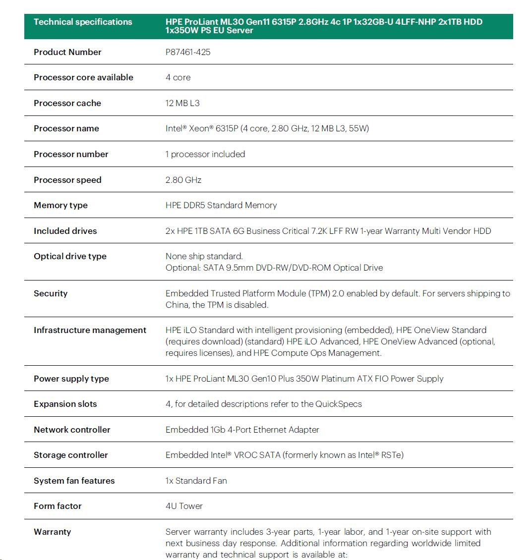 Popis HPE PL ML30g11 6315P (2.8-5.2G/4C4T) 1x32G 2x1TB SATA 4LFF-NHP 1x350 VROC 4p1G NBD311 Smart Choice