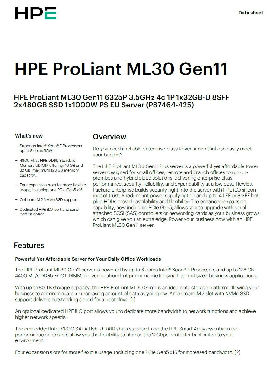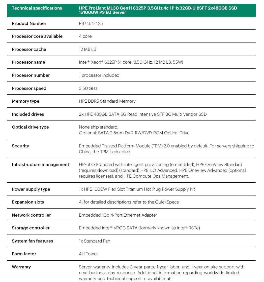 Popis HPE PL ML30g11 6325P (3.5G/4C8T) 1x32G 2x480G SSD 8SFF VROC 1x1000W 4p1G NBD311 Smart Choice