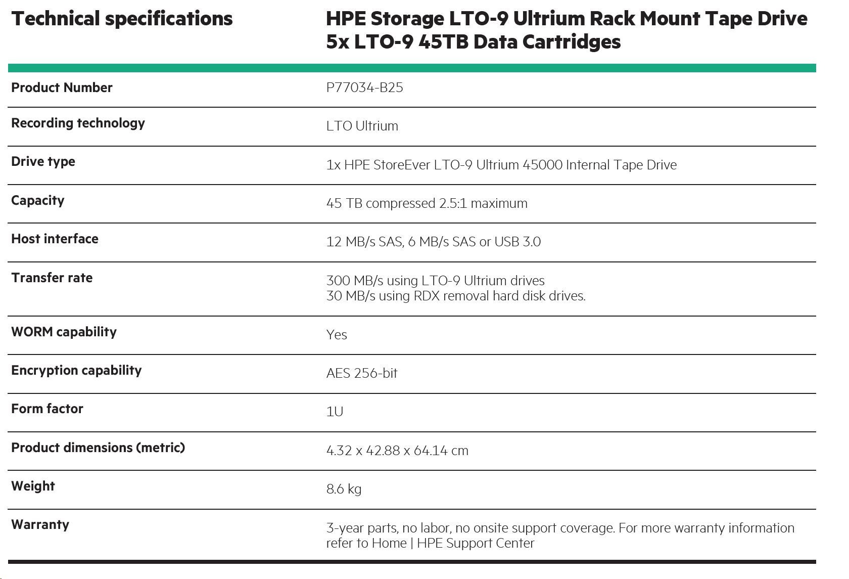 HPE StoreEver Rack-mount Kit is ideal for customers who have limited space in their rack as it allows for a smaller footprint leaving valuable space for other key components in the data center. The 1U HPE StoreEver Rack-mount Kit allows users to mix a variety of technologies, including LTO Ultrium, as well as RDX removable disk technology by selecting the appropriate cabling. The enclosures support standard internal LTO tape drives and HPE RDX Removable Disk Backup System, allowing for drive upgrades when you need additional capacity or want to migrate to a new generation of LTO tape drives or RDX removable disk technology.Data sheet Page 2 Provides up to 90 TB of storage capacity (assuming 2.5:1 compression) using two LTO-9 Ultrium 45000 drives or up to 8 TB of storage capacity using two RDX 4 TB removable hard disk drives. Data transfer rates up to 300 MB/s using LTO-7, LTO-8, or LTO-9 Ultrium drives or up to 30 MB/s using two RDX removable hard disk drives.