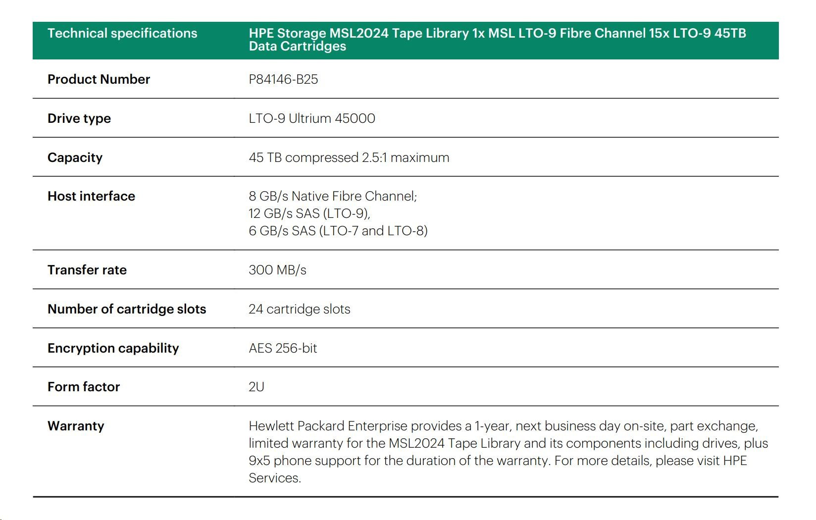 HPE Storage MSL2024 Tape Library 1x MSL LTO-9 Fibre Channel 15x LTO-9 45TB Data Cartridges