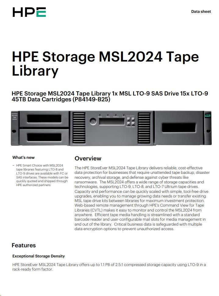 Popis HPE Storage MSL2024 Tape Library 1x MSL LTO-9 SAS Drive 15x LTO-9 45TB Data Cartridges