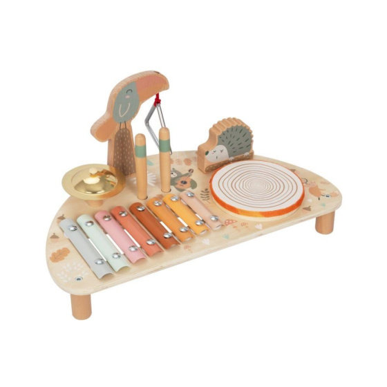 Drevený hudobný stolček pre deti so sadou 5 hudobných nástrojov na jednom mieste, s krásnou maľbou a so zvieratkami z lesa, prebudí lásku k hudbe v každom dieťati. Hudobný stolček obsahuje základné detské hudobné nástroje, ktoré stimulujú zmysly, zdokonaľujú jemnú motoriku, oboznámi deti s tým, aké zvuky ktorý nástroj vydáva, ako sa naň hraje.
