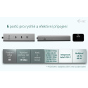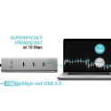 Prenos dát je rýchly a spoľahlivý vďaka portom USB-C 3.2 Gen 1 a Gen 2 s rýchlosťou až 10 Gbps. Pri pripojení 100W PD zdroja získa vaše zariadenie až 85 W energie, zatiaľ čo hub si ponechá 15 W pre vlastný chod.