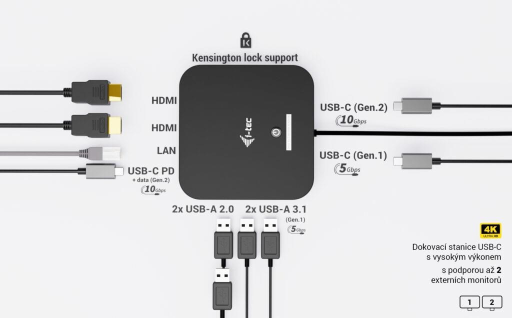 Moderná USB-C dokovacia stanica pre kancelárske použitie s podporou až dvoch externých monitorov v rozlíšení 4K. Stanica je kompatibilná s akýmkoľvek notebookom vybaveným portom USB-C, USB4 alebo Thunderbolt 3/4/5. Ponúka 6 USB portov, spoľahlivé a rýchle pripojenie k firemnej sieti vďaka integrovanému LAN portu a možnosťinštalácie za monitor, čo z nej robí ideálneho partnera pre profesionálne použitie. Samozrejmosťou je aj schopnosť nabíjania notebooku alebo tabletu výkonom až 100 W.