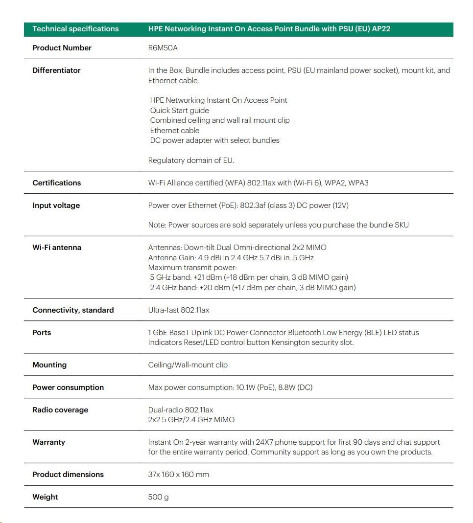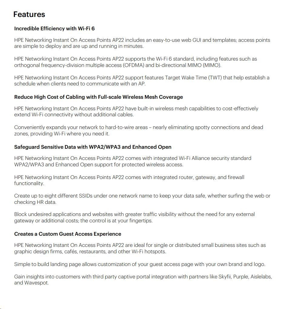 | Trusted Platform Module (TPM) All Aruba Instant On access points have an installed TPM for secure storage of credentials, keys, and boot codes. |