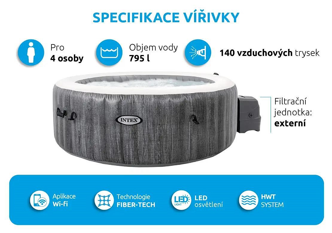 | Funkce vířivky | HWT - pro změkčení vody; Ovládání mobilní aplikací; LED osvětlení |