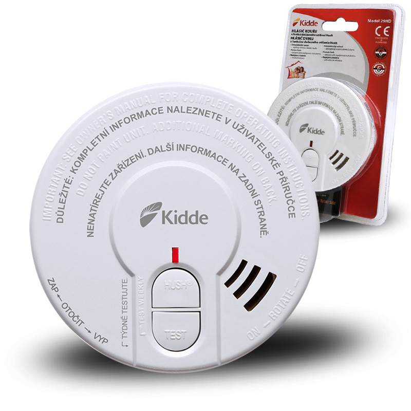 Hasiaci prístroj je vybavený testovacím tlačidlom TEST na kontrolu správneho fungovania zariadenia a HUSH na krátkodobé umlčanie požiarnej signalizácie v prípade planého poplachu. Stlačenie tlačidla spôsobí okamžitú deaktiváciu alarmu na približne 10 minút, zníženie citlivosti obvodov a vypnutie akustickej signalizácie hlásiča. Tlačidlo HUSH používajte iba v prípade, že poznáte príčinu aktivácie hlásiča (napr. pri varení alebo smažení). Po cca 10 minútach od deaktivácie sa hlásič automaticky resetuje do pôvodného nastavenia na monitoring požiarneho nebezpečenstva. Ak v miestnosti zostane vysoká koncentrácia koure, môžete tlačidlo HUSH opakovane stláčať, až kým miestnosť nebude riadne vyvetraná. Tento model je vybavený najmodernejším fotoelektrickým senzorom Kidde.