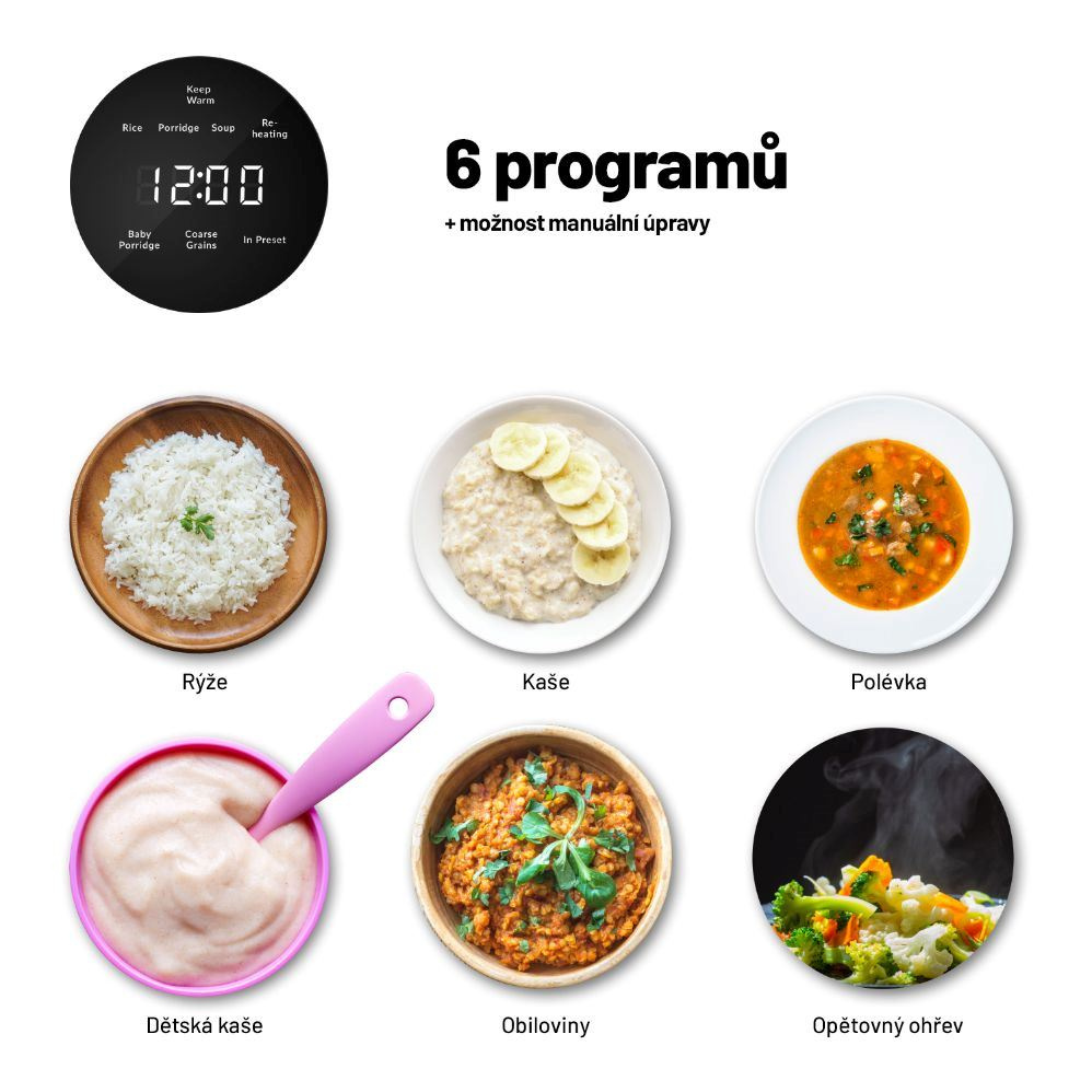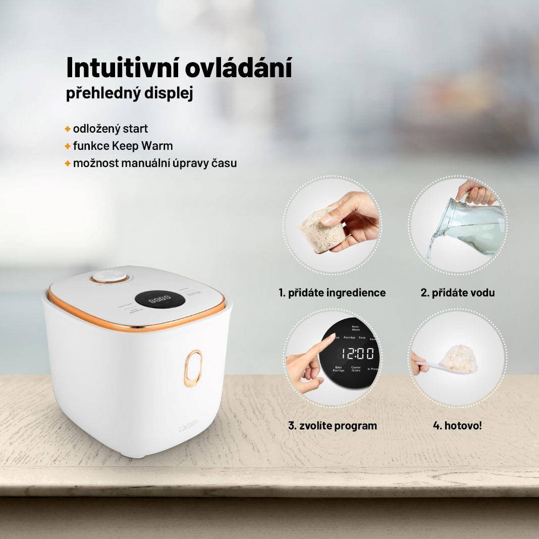 Každý, kto si potrpí na prvotriedne pripravené pokrmy a zároveň nechce tráviť veľa času v kuchyni, by sa mal vybaviť multifunkčným ryžovarom. Lauben Multifunction Rice Cooker 1200WR pripraví po stlačení jediného tlačidla všetky druhy ryže tým správnym spôsobom. Navyše disponuje 6 prednastavenými funkciami - Rice, Porridge, Soup , Re-heat, Baby Porridge, Coarse Grains – na jednoduchú prípravu polievok, kaší, obilnín či opätovný ohrev. Zdá sa vám program krátky? Upravte si ho, niektoré umožňujú manuálne nastavenie času.