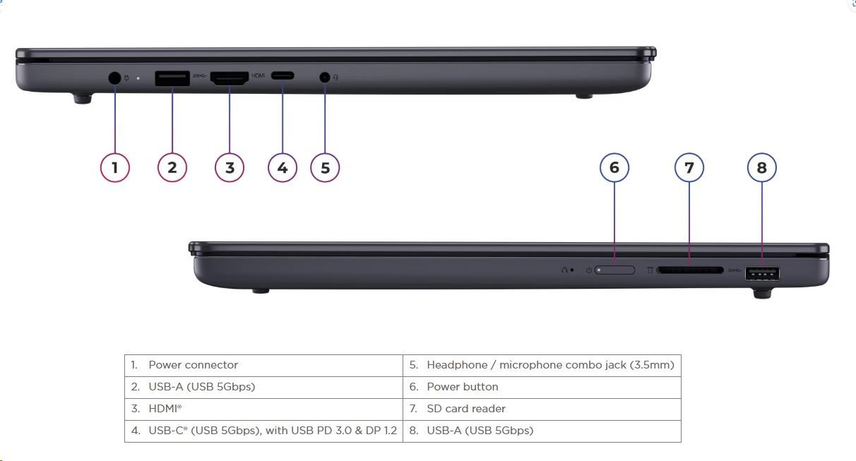 | Standartné porty | 2x USB-A (USB 5Gbps / USB 3.2 Gen 1) 1x USB-C® (USB 5Gbps / USB 3.2 Gen 1), with USB PD 3.0 and DisplayPort™ 1.2 1x HDMI® 1.4 1x Headphone / microphone combo jack (3.5mm) 1x SD card reader 1x Power connector |