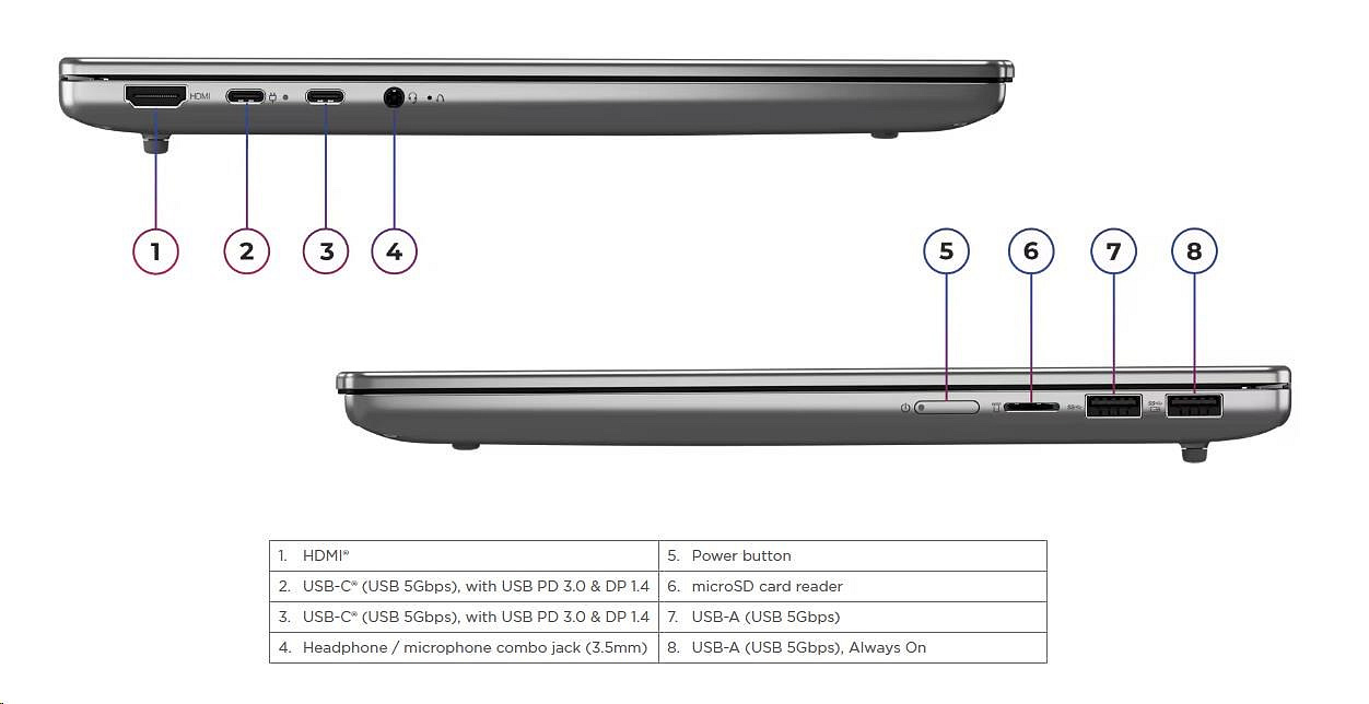 | Standartné porty | 1x USB-A (USB 5Gbps / USB 3.2 Gen 1) 1x USB-A (USB 5Gbps / USB 3.2 Gen 1), Always On 2x USB-C® (USB 5Gbps / USB 3.2 Gen 1), with USB PD 3.0 and DisplayPort™ 1.4 1x HDMI® 2.1, up to 4K/60Hz 1x Headphone / microphone combo jack (3.5mm) 1x microSD card reader |