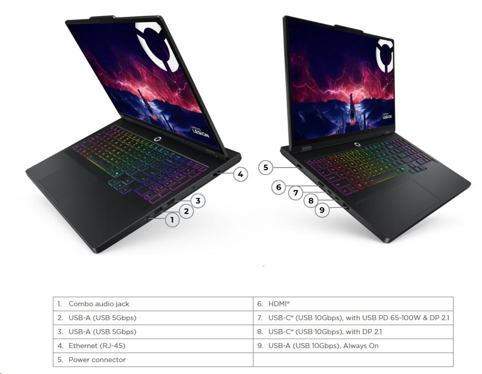 | Standartné porty | 2x USB-A (USB 5Gbps / USB 3.2 Gen 1) 1x USB-A (USB 10Gbps / USB 3.2 Gen 2), Always On 1x USB-C® (USB 10Gbps / USB 3.2 Gen 2), with DisplayPort™ 2.1 1x USB-C® (USB 10Gbps / USB 3.2 Gen 2), with USB PD 65-100W and DisplayPort™ 2.1 1x HDMI® 2.1, up to 8K/60Hz 1x Headphone / microphone combo jack (3.5mm) 1x Ethernet (RJ-45) 1x Power connector |