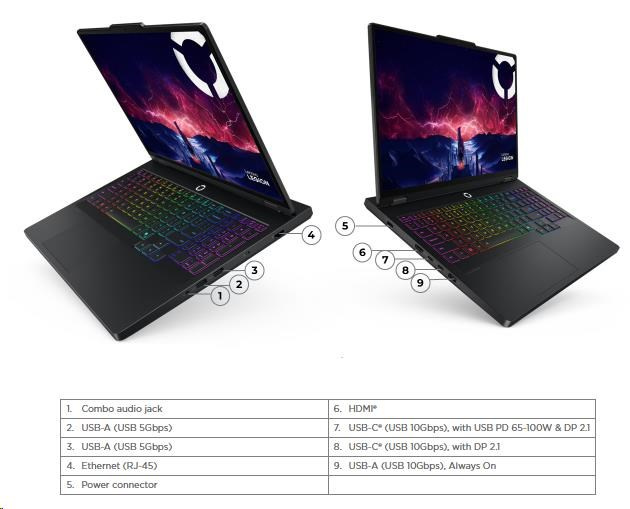 | Standartné porty | 2x USB-A (USB 5Gbps / USB 3.2 Gen 1) 1x USB-A (USB 10Gbps / USB 3.2 Gen 2), Always On 1x USB-C® (USB 10Gbps / USB 3.2 Gen 2), with DisplayPort™ 2.1 1x USB-C® (USB 10Gbps / USB 3.2 Gen 2), with USB PD 65-100W and DisplayPort™ 2.1 1x HDMI® 2.1, up to 8K/60Hz 1x Headphone / microphone combo jack (3.5mm) 1x Ethernet (RJ-45) 1x Power connector |