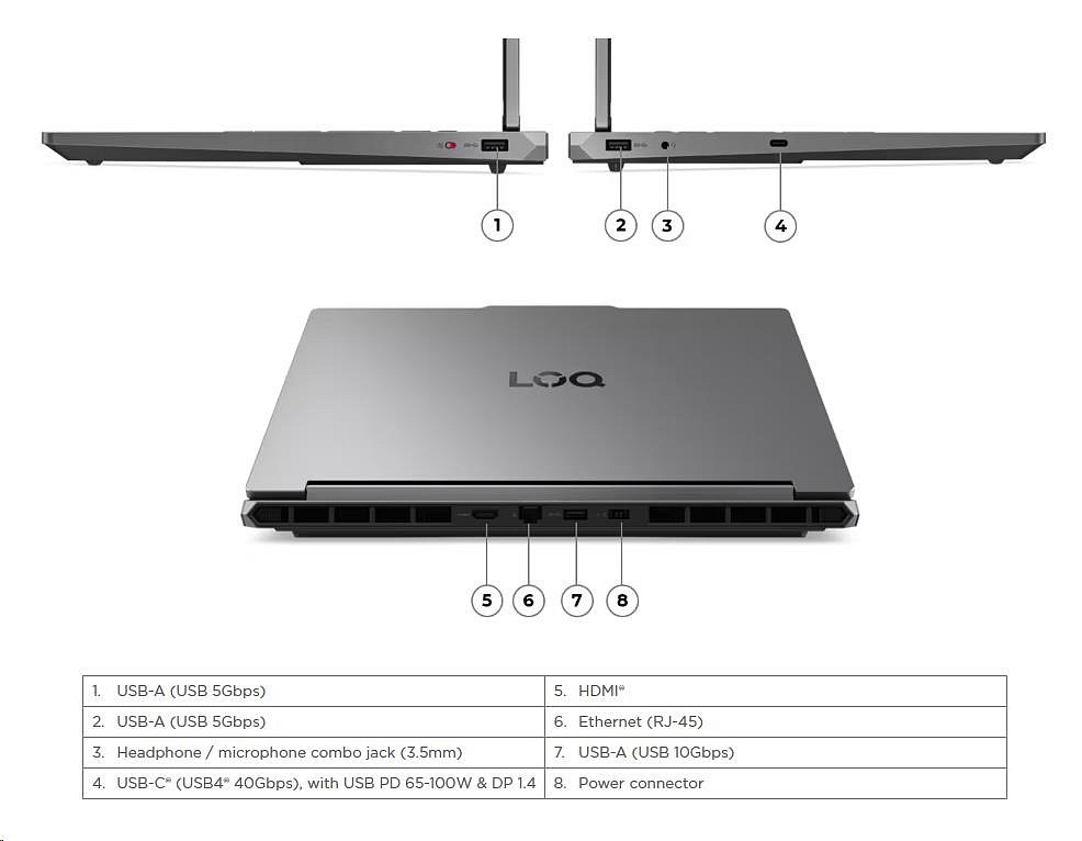 | Standartné porty | 2x USB-A (USB 5Gbps) 1x USB-A (USB 10Gbps) 1x USB-C® (USB4® 40Gbps), with USB PD 65-100W and DisplayPort™ 1.4 1x HDMI® 2.1, up to 8K/60Hz 1x Headphone / microphone combo jack (3.5mm) 1x Ethernet (RJ-45) 1x Slim tip Power connector |